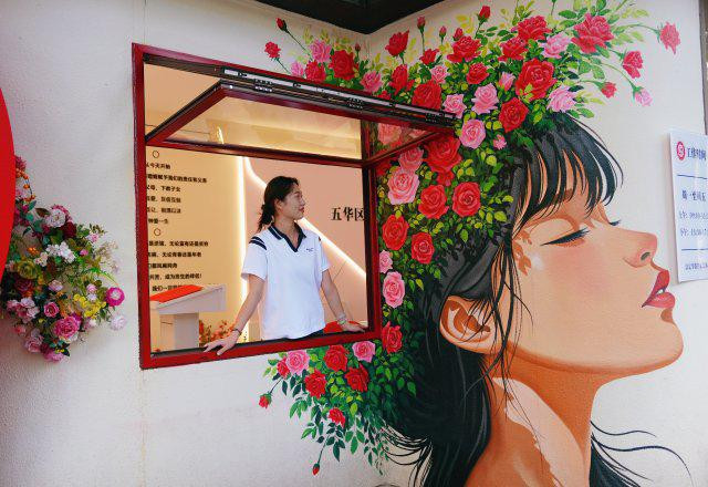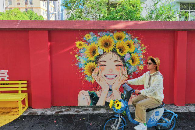 位于五一路婚姻登记点旁的两幅墙绘作品,以绚烂的繁花为背景,与前来登记的新人共同构成一幅温馨画面,寓意着如同画中爱意永不褪色、繁花永不凋零的美好祝愿。