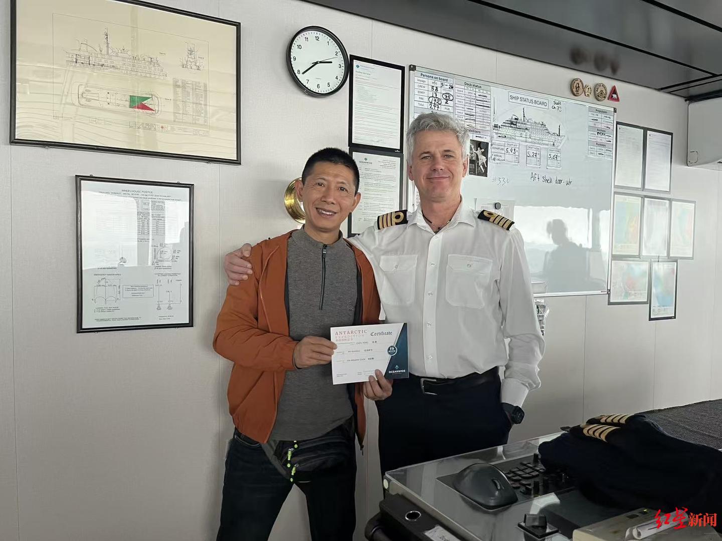 ▲陈勇和宏迪斯号探险邮轮船长合影 陈勇供图