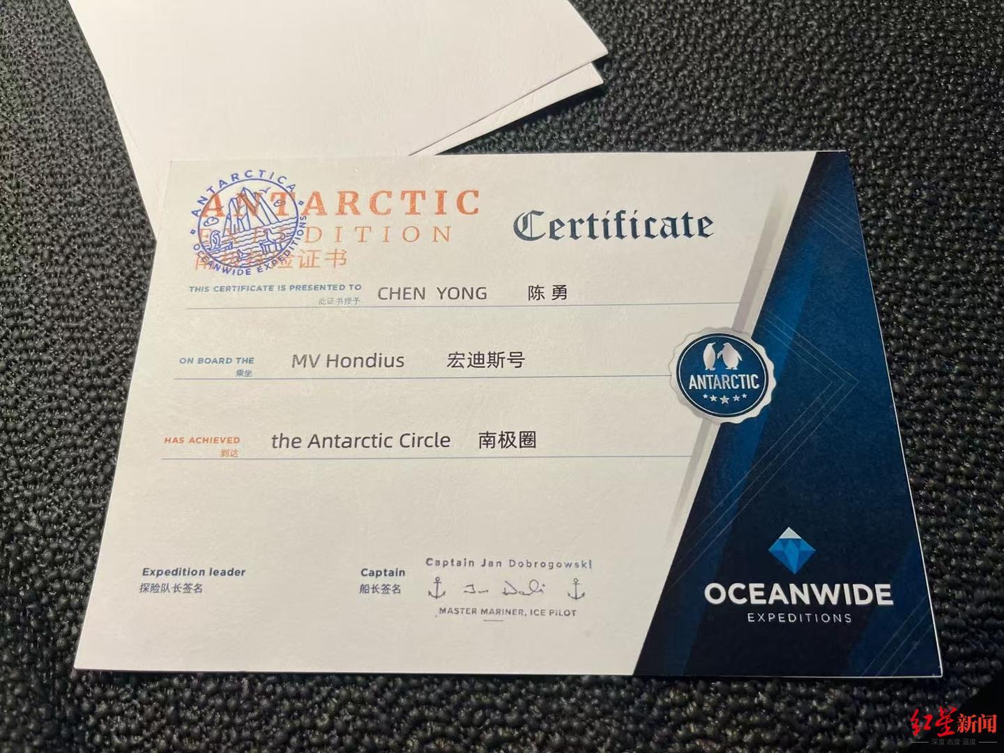 3月24日,陈勇接受红星新闻独家采访时称:“目前风浪很大,我们睡觉时,偶尔整个人都跟着船体一起起伏。浪高大约有4至5米。中午,我们乘坐的宏迪斯号探险邮轮跨过南纬66°33′,正式进入南极圈。我特意请船长盖上了他的名字印章留念。”陈勇说,曾经驾车进入北极圈,如今乘船驶入南极圈,终于实现了双极圈跨越,也让我的南极之行更加圆满。