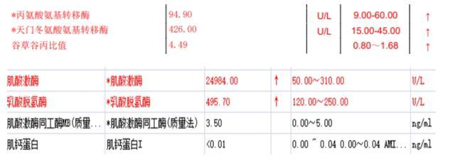 肌酸激酶(CK) :24984 U/L (正常 50-310) —— 飙升80倍!CK是肌肉损伤最核心的指标。超过正常值上限5倍即可诊断。本例高达80倍,提示大范围肌肉坏死。临床上CK超过5000 U/L时,急性肾衰竭风险显著升高。