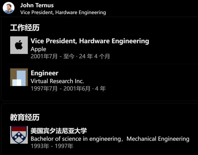 JohnTernus毕业于宾大机械工程专业,2001年加入苹果,已经是一名入职近25年的老将了